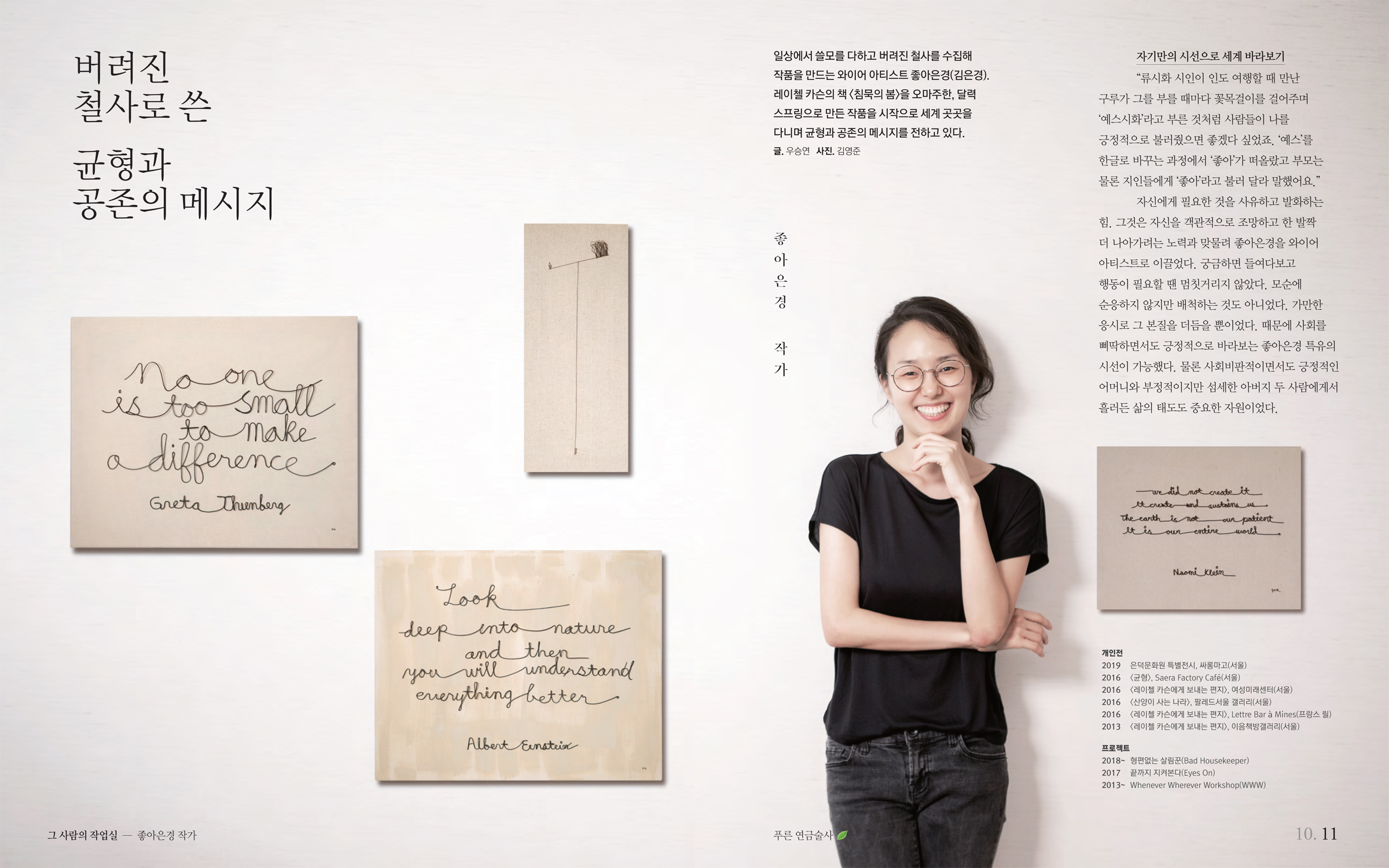 버려진 철사로 시작된 좋아은경의 작업은 인간을 포함한 자연에게 말을 거는 행위였다. 쓰레기 없는 여행 '형편없는 살림꾼 프로젝트', 매주 목요일마다 나무에 관한 글귀를 철사로 필사해 SNS에 업로드하는 '나무 읽는 목요일' 모두 나지막이 흘러드는 이야기를 듣고 지속가능한 미래를 고민하는 좋아은경만의 실천이었다. 어쩌면 코로나19 시절 고립될 수밖에 없는 개체에게 전하는 따듯하고 실제적인 위로일 것이다.