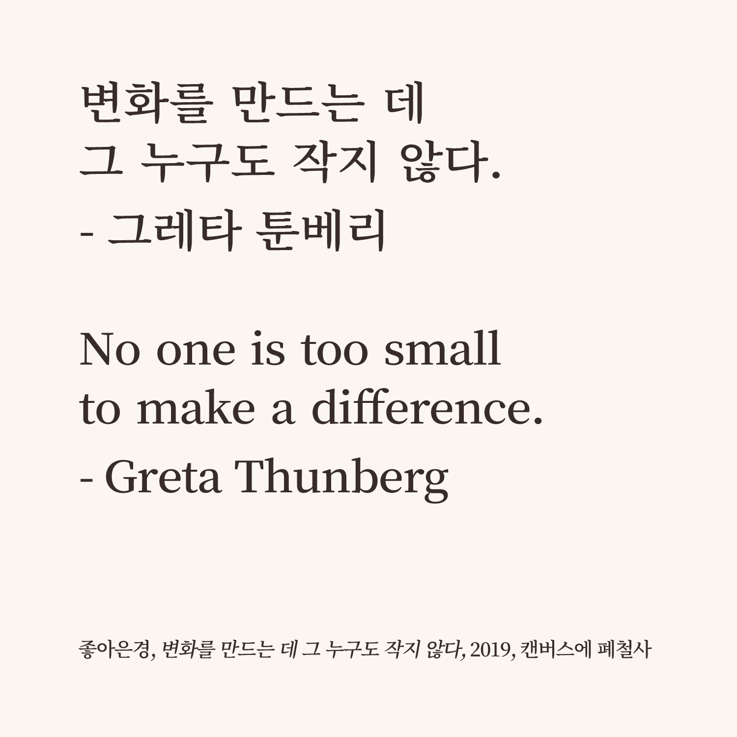그레타 툰베리의 문장을 철사로 옮긴 <변화를 만드는 데 그 누구도 작지 않다>와 달력의 철사로 만든 <침묵의 봄> 시리즈를 출품했습니다.