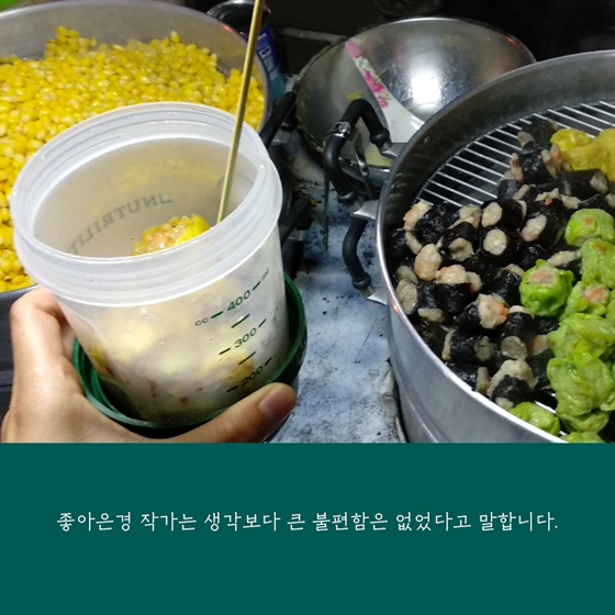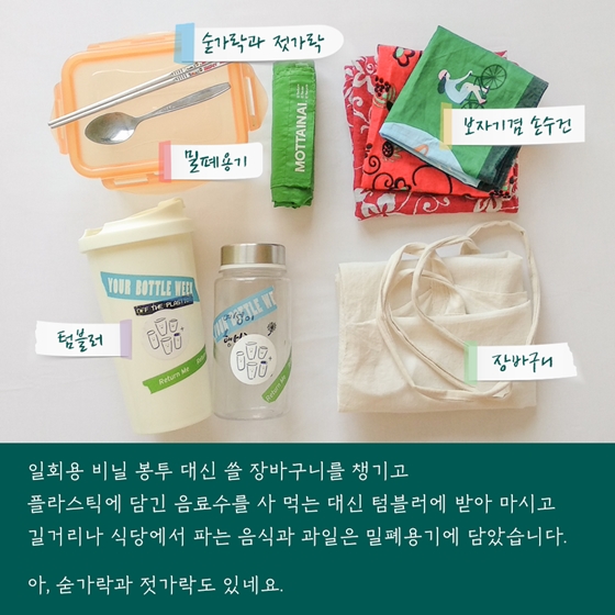 좋아은경 작가는 생각보다 큰 불편함은 없었다고 말합니다. 일회용 비닐 봉투 대신 쓸 장바구니를 챙기고, 플라스틱에 담긴 음료수를 사 먹는 대신 텀블러에 받아 마시고, 길거리나 식당에서 파는 음식과 과일은 밀폐용기에 담았습니다. 물론 숟가락과 젓가락도 챙겼습니다.