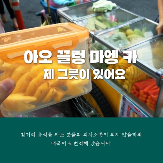 길거리 음식을 파는 분들과 의사소통이 되지 않을까봐 태국어로 번역해 갔습니다.