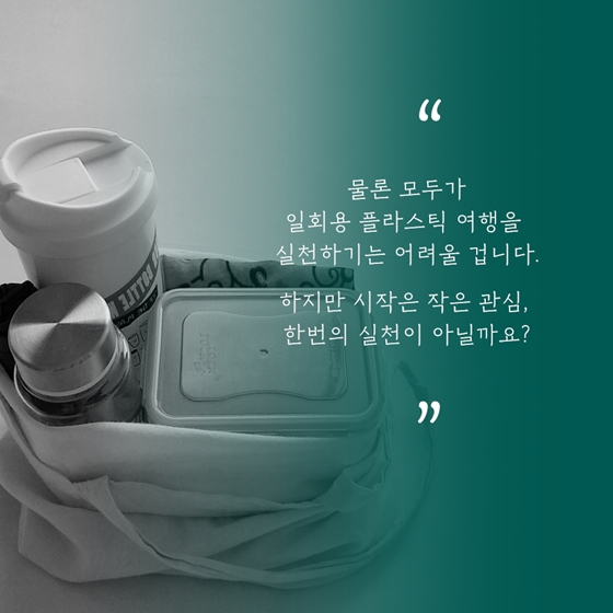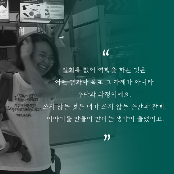"일회용 없이 여행을 하는 것은 어떤 결과나 목표 그 자체가 아니라 수단과 과정이에요. 쓰지 않는 것은 내가 쓰지 않는 순간과 관계, 이야기를 만들어 간다는 생각이 들어요."
