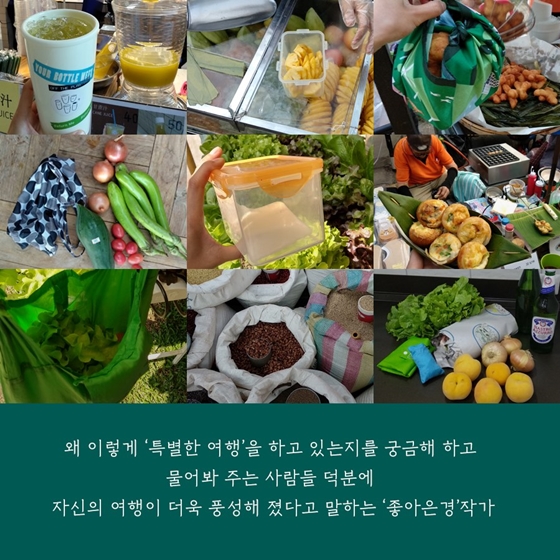 왜 이렇게 '특별한 여행'을 하고 있는지를 궁금해 하고 물어봐 주는 사람들 덕분에 자신의 여행이 더욱 풍성해졌다고 말하는 좋아은경 작가. 물론 모두가 일회용 플라스틱 제로 여행을 실천하기는 어려울 겁니다. 하지만 시작은 작은 관심, 한번의 실천이 아닐까요?
